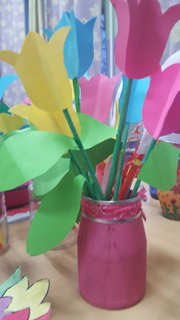 На часу ликовне културе ученици 4/2 (учитељица Марија Милинковић) правили су цветове од папира у боји. Своје радове поклањали су мамама и запосленима у школи.